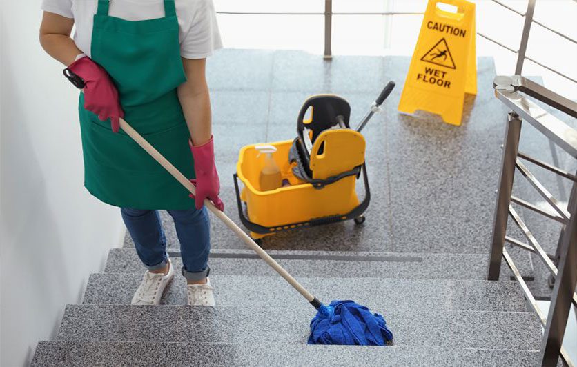 - Kehren und feuchtes Wischen aller Stufen, Podeste und Flure